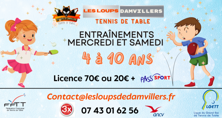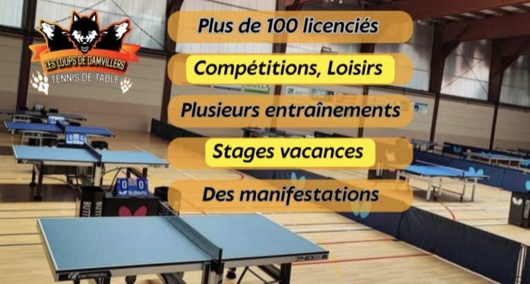 En cette année olympique, quoi de mieux que de se mettre au sport😊. Le club des Loups de Damvillers tennis de table offre à tous, petits et grands, débutants ou confirmés, les meilleures conditions pour se dépenser dans un cadre ludique et convivial. Les « effets » n’auront plus aucun secret pour les licenciés du Club ! Seul, en famille ou avec des amis, toutes les séances sont encadrées par un entraîneur. Avec la licence découverte, profitez de nos créneaux pendant 1 mois gratuitement. Nous prenons les chèques vacances, pass’sports, paiement en ligne en 3X, par carte bancaire etc….. Pour nous contacter : Par Tél : 07 43 01 62 56 Par email : contact@lesloupsdedamvillers.fr Gymnase, rue zierenberg, 55150 DAMVILLERS